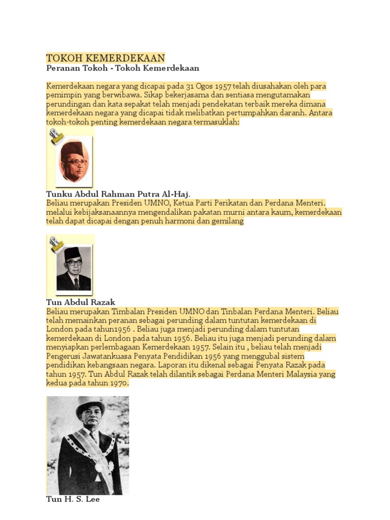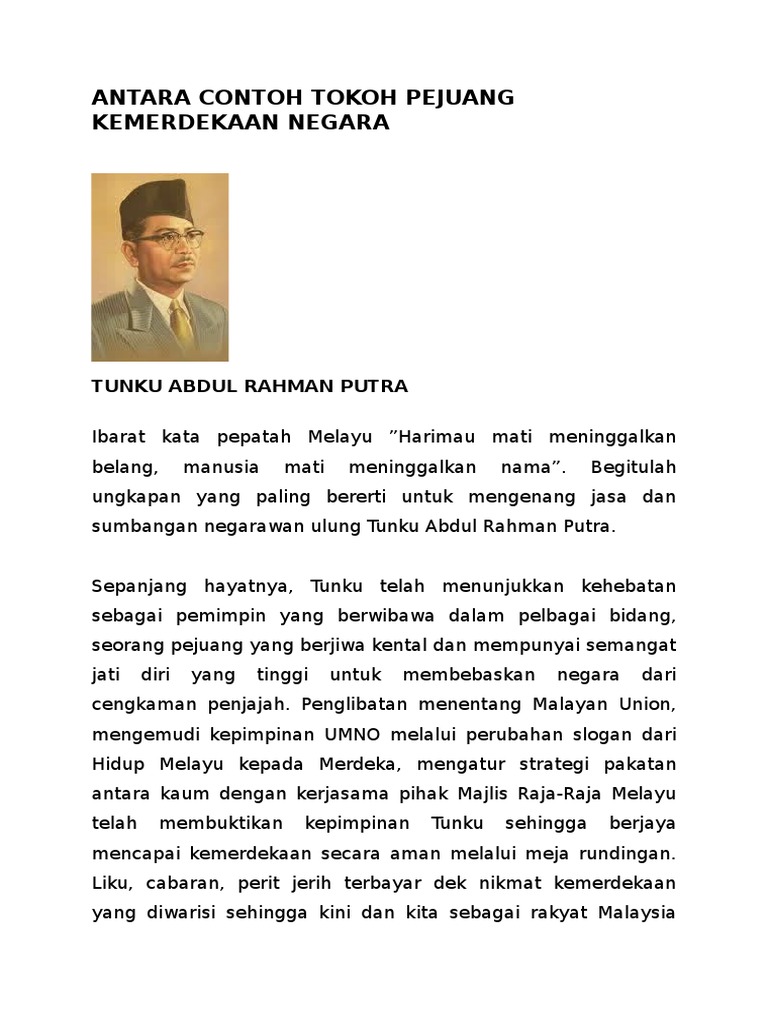 Kemerdekaan ini diproklamasikan oleh Soekarno dan Moh. SJKT Ladang Kelan Isi Kandungan Tajuk mukasurat 3-4 1. Biodata Dan Sejarah Tunku Abdul Rahman Untuk Merdeka Oleh Nurul Kasmadillawati Zakaria Tunku Abdul Rahman Putra Al-Haj adalah perdana Menteri Malaysia yang pertama dan merupakan bapa kemerdekaan Malaysia.